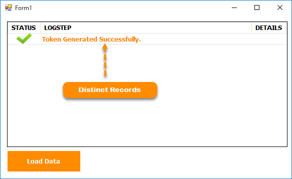 As you can see from the above code and if you analyzed the code then here we used LINQ to get distinct values from the data table and here we created a group of "LOGSTEP" using group by clause and finally select the first record from each and prepare a data table and copy this data table to our actual data table "dtValidate" using CopyToDataTable() method. This method is used to take the results of a query and copy the data into the DataTable. And finally, give the data source to the grid view "dgvVerifyReport" and you can see the result as I showed above.